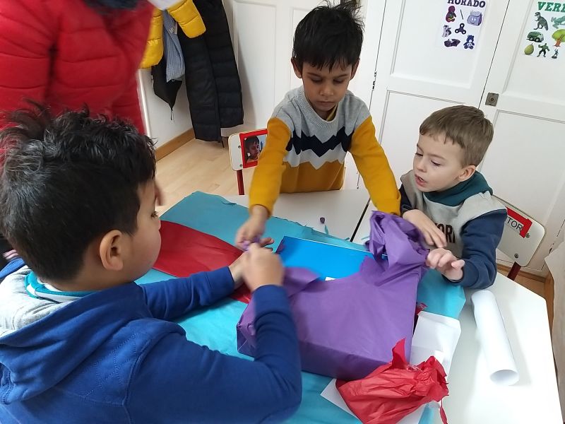 Aquest any les festes s’han acabat i a la tornada cada grup ha trobat sobre la taula regals que els Reis d’Orient havien deixat! Uns regals que ells mateixos van demanar en cartes escrites i il·lustrades amb imatges per assegurar-se que els reis no s’equivocarien. Els seus desitjos es van fer realitat: del paper de la carta, a la caixa embolicada… una bona forma d’entendre l’ús i la màgia de les paraules escrites.