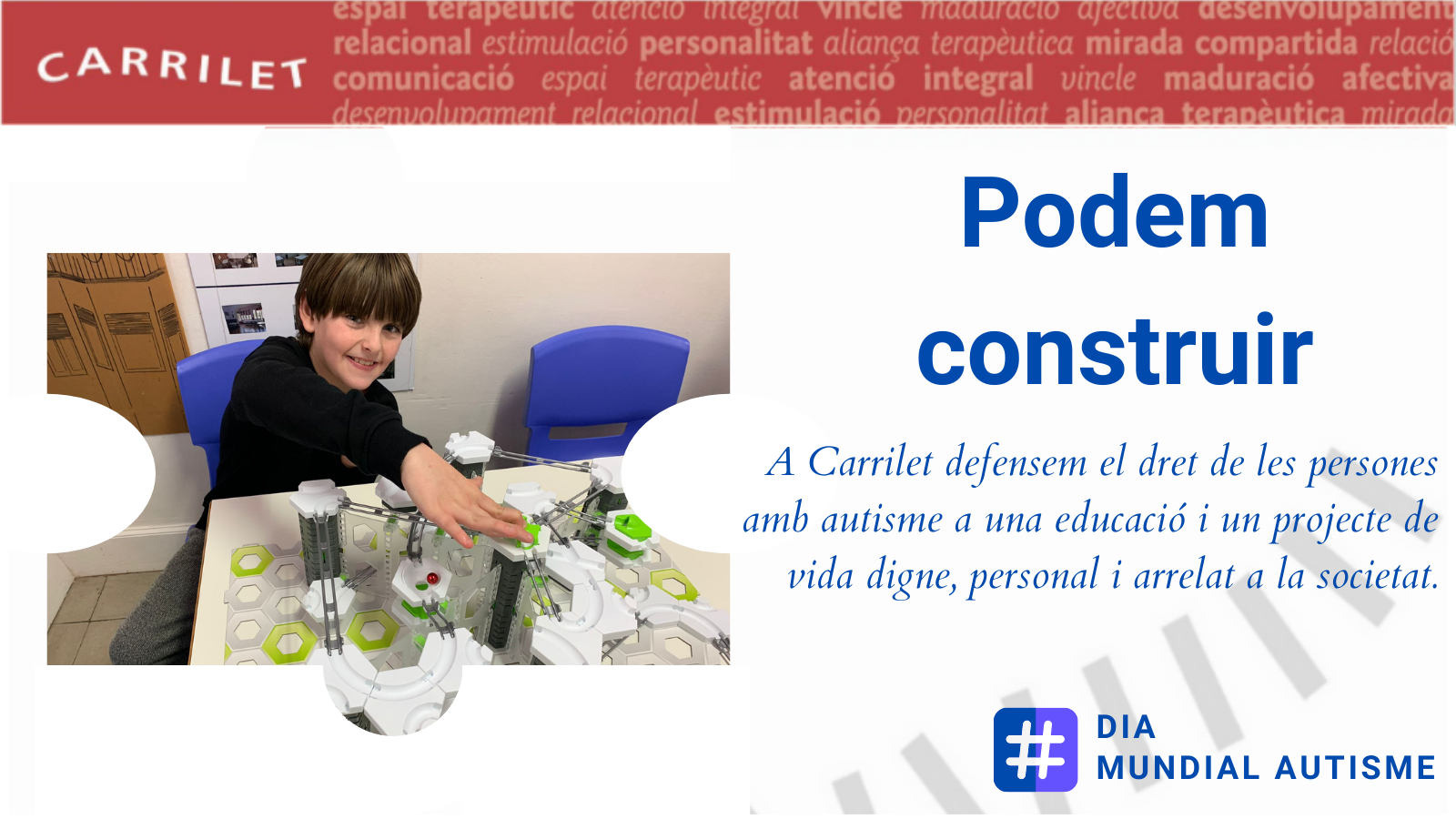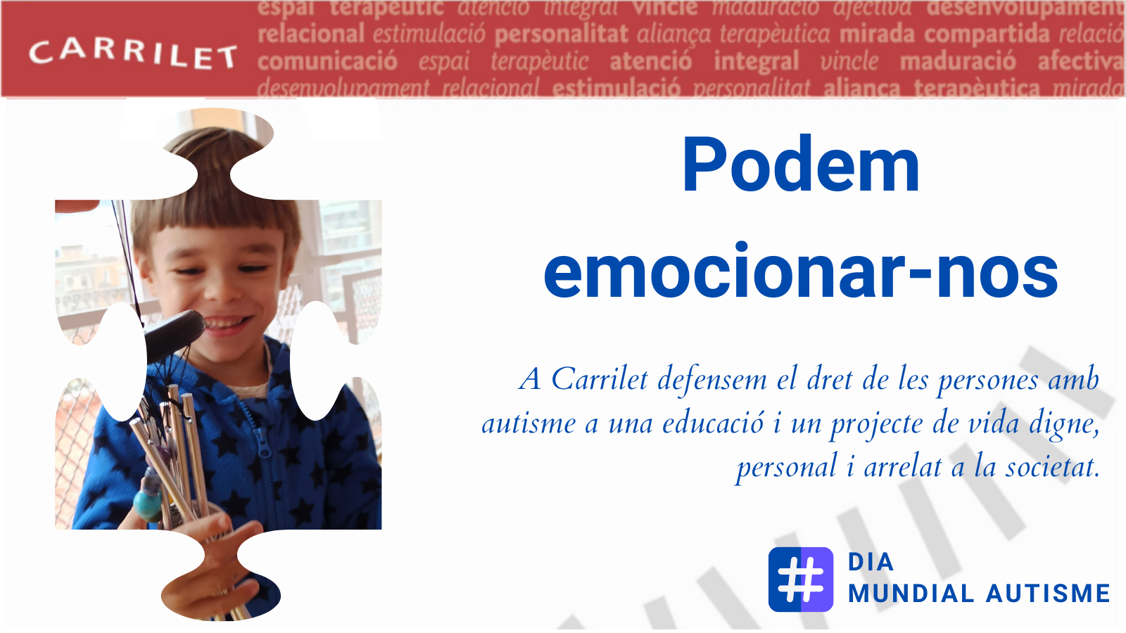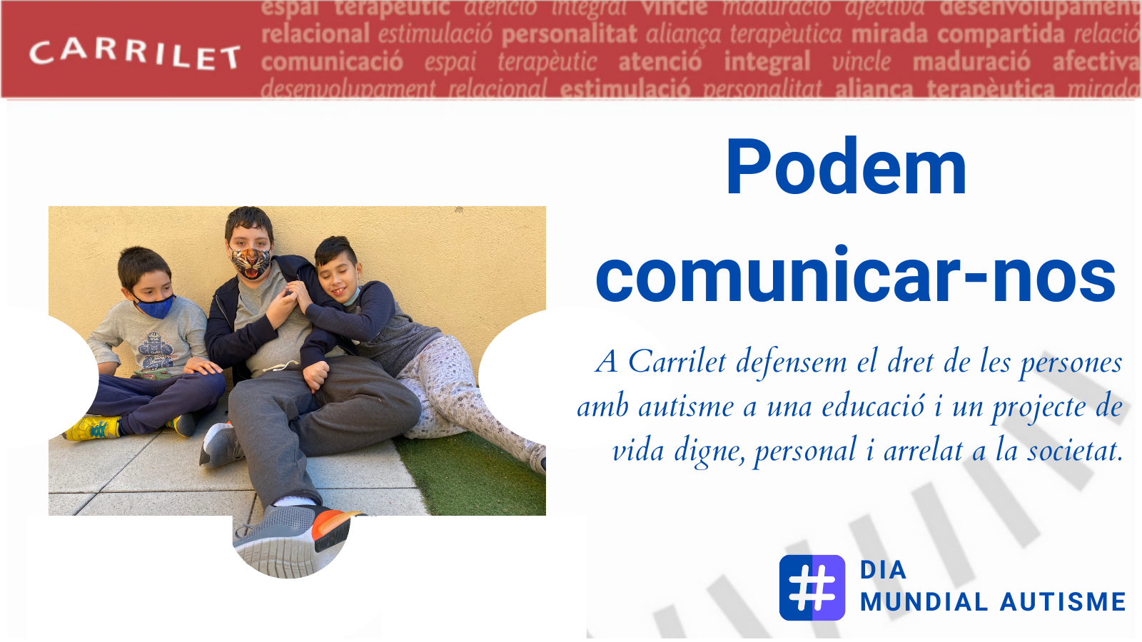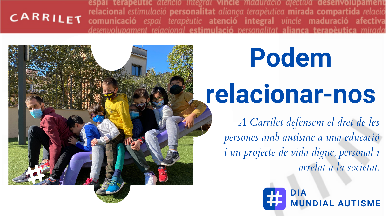 Barcelona, 31 de març de 2021. S’aproxima una data assenyalada el Dia Internacional de Conscienciació de l’Autisme i CARRILET presenta el balanç de la seva activitat del 2020, un any en el qual han canviat totes les activitats de totes les persones. Tot i el confinament, Núria Farrés, presidenta de la cooperativa, destaca que “tot l’equip de CARRILET es va bolcar en pensar i dissenyar noves formes d’accedir a nens que per la mateixa patologia ja busquen un aïllament del món que els envolta”. Amb aquest esperit i la responsabilitat de ser un centre de referència específica i especialitzada en el Trastorn de l’Espectre Autista, TEA, van elaborar documents sobre temes referents al TEA en situació de confinament per a l’adolescència, l’edat adulta i els infants.