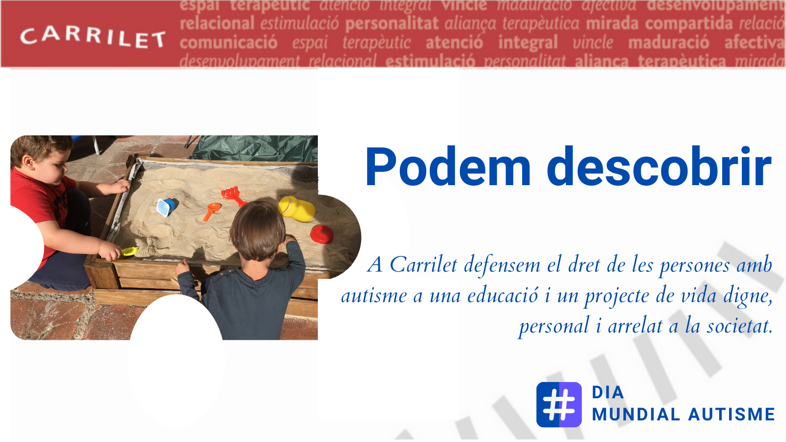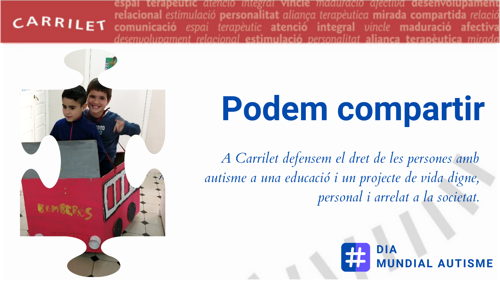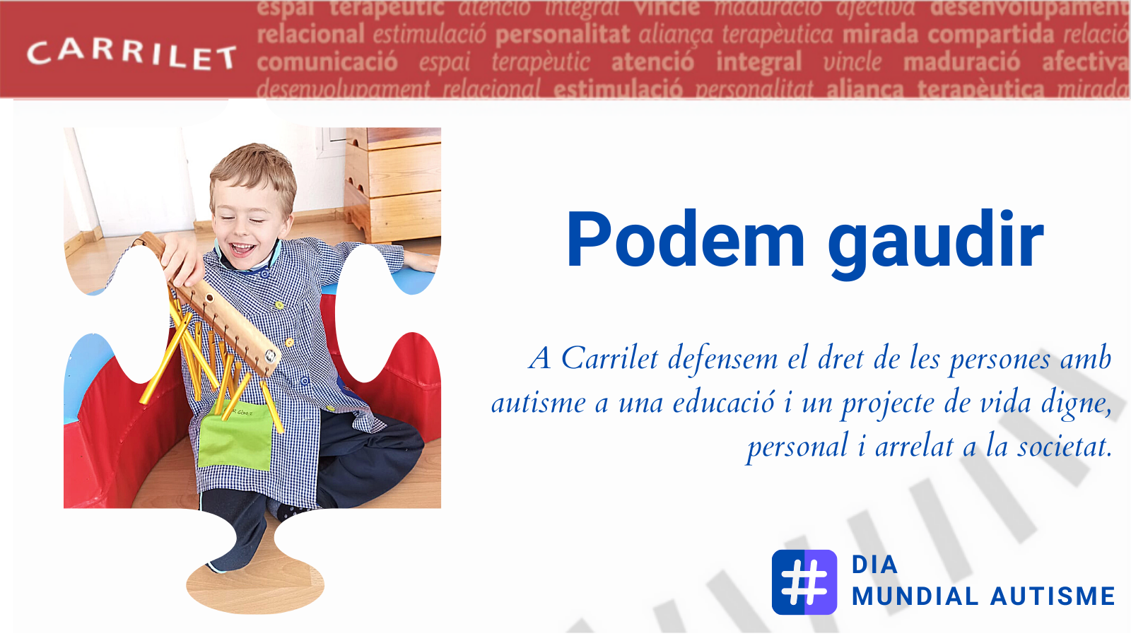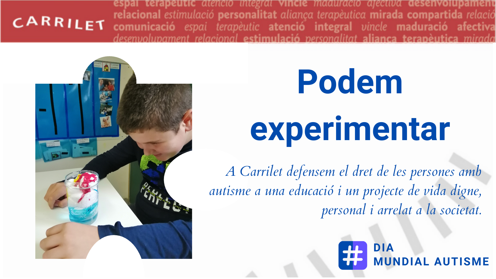 Barcelona, 31 de març de 2021. S’aproxima una data assenyalada el Dia Internacional de Conscienciació de l’Autisme i CARRILET presenta el balanç de la seva activitat del 2020, un any en el qual han canviat totes les activitats de totes les persones. Tot i el confinament, Núria Farrés, presidenta de la cooperativa, destaca que “tot l’equip de CARRILET es va bolcar en pensar i dissenyar noves formes d’accedir a nens que per la mateixa patologia ja busquen un aïllament del món que els envolta”. Amb aquest esperit i la responsabilitat de ser un centre de referència específica i especialitzada en el Trastorn de l’Espectre Autista, TEA, van elaborar documents sobre temes referents al TEA en situació de confinament per a l’adolescència, l’edat adulta i els infants.